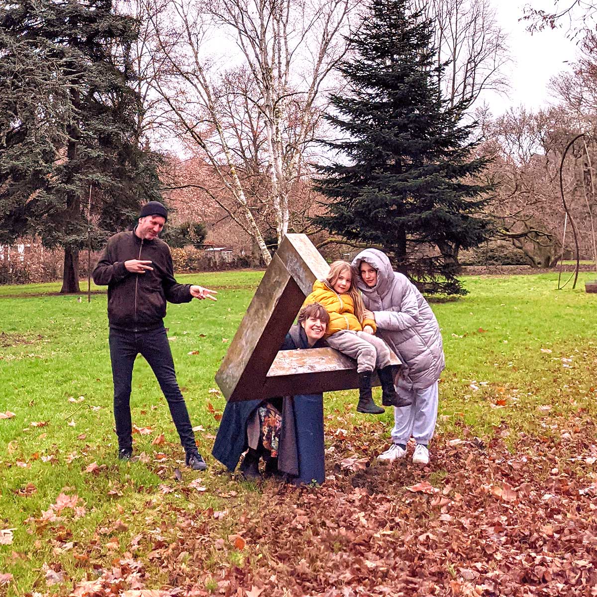 A family gathers around a wooden Penrose triangle found in a forest.