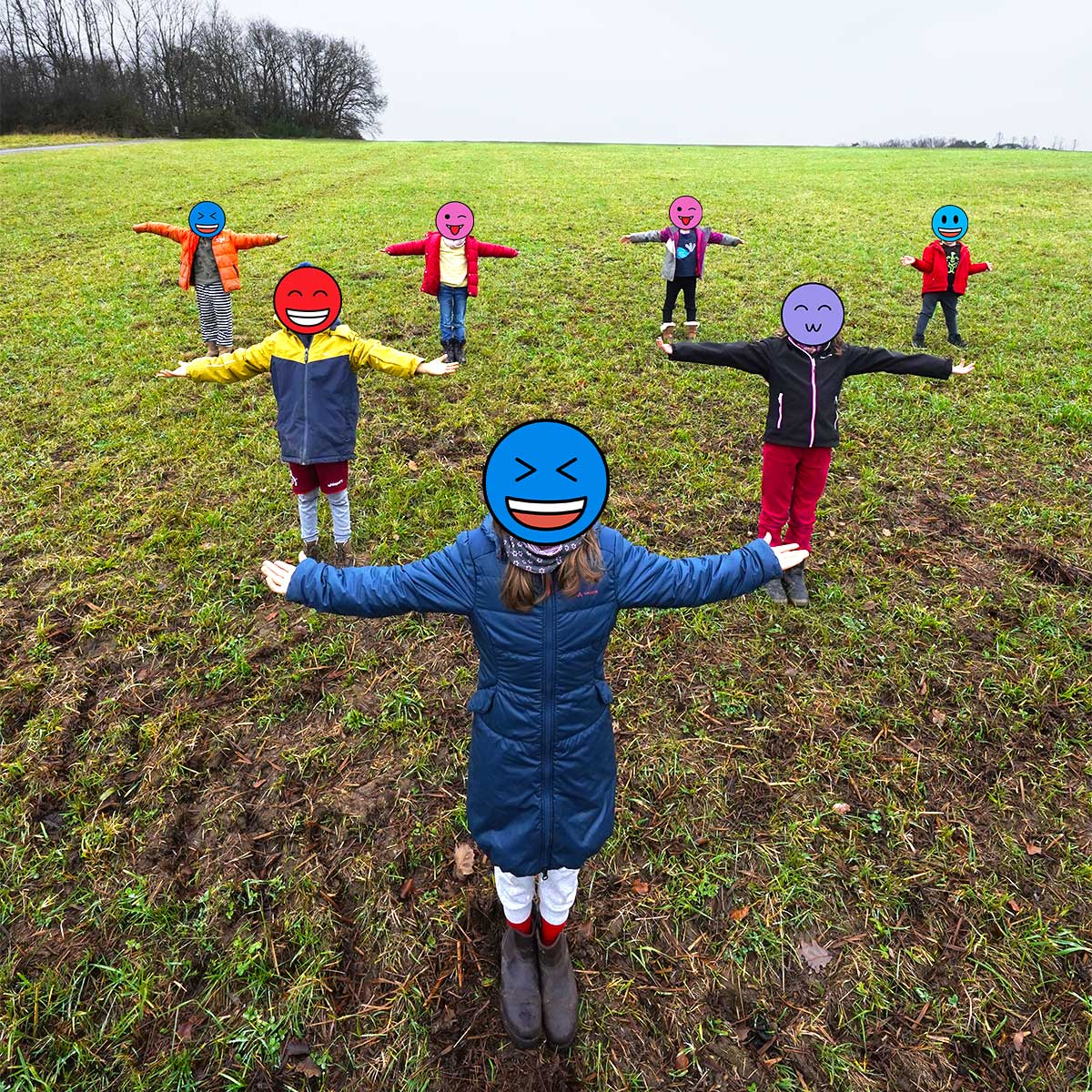 Seven kids on a grassy field forming a tree fractal through forced perspective.