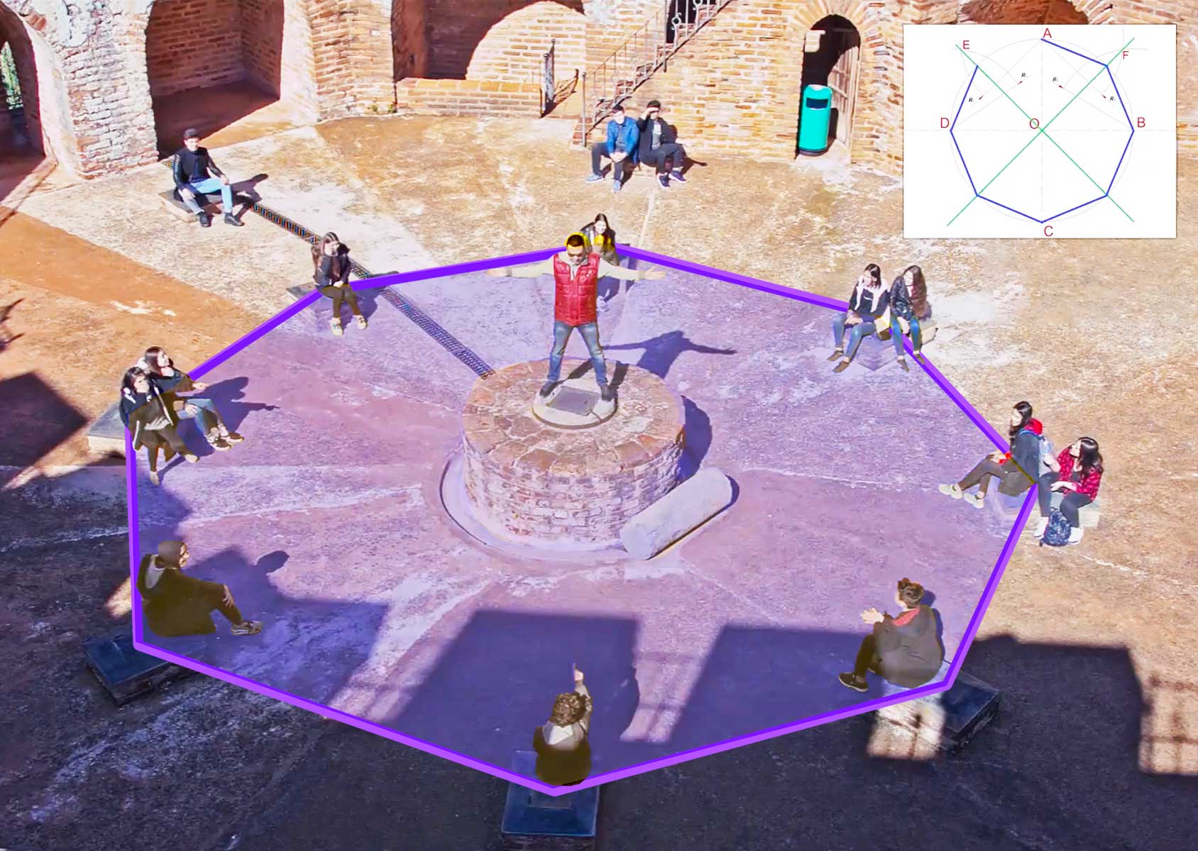 School kids sit on platforms laid out in an octogon in an old city fortress tower.